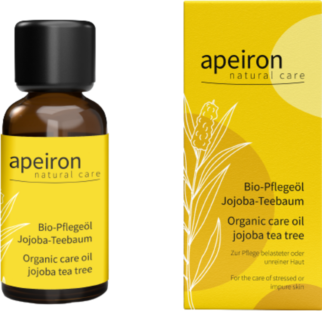 Био масло от жожоба от контролирано биологично земеделие и първокласно масло от чаено дърво. В комбинация с подхранващите свойства на маслото от жожоба, Apeiron Jojoba-Teebaumöl е подходящо при несъвършенства по кожата, пъпки, напукани кожички около ноктите, лющещи се участъци и след неприятен контакт с насекоми. Масаж или топла вана с масло от жожоба и чаено дърво подпомагат усещането за отпускане след физически натоварвания и спортни активности. Вана за крака и масаж на стъпалата с това масло за грижа освежават уморените крака и допринасят за балансиран комфорт. Маслото от жожоба и маслото от чаено дърво са уникални със своя състав. В Apeiron Jojoba-Teebaumöl се съчетава синергията на двете масла, чиито разнообразни качества са високо ценени отдавна.