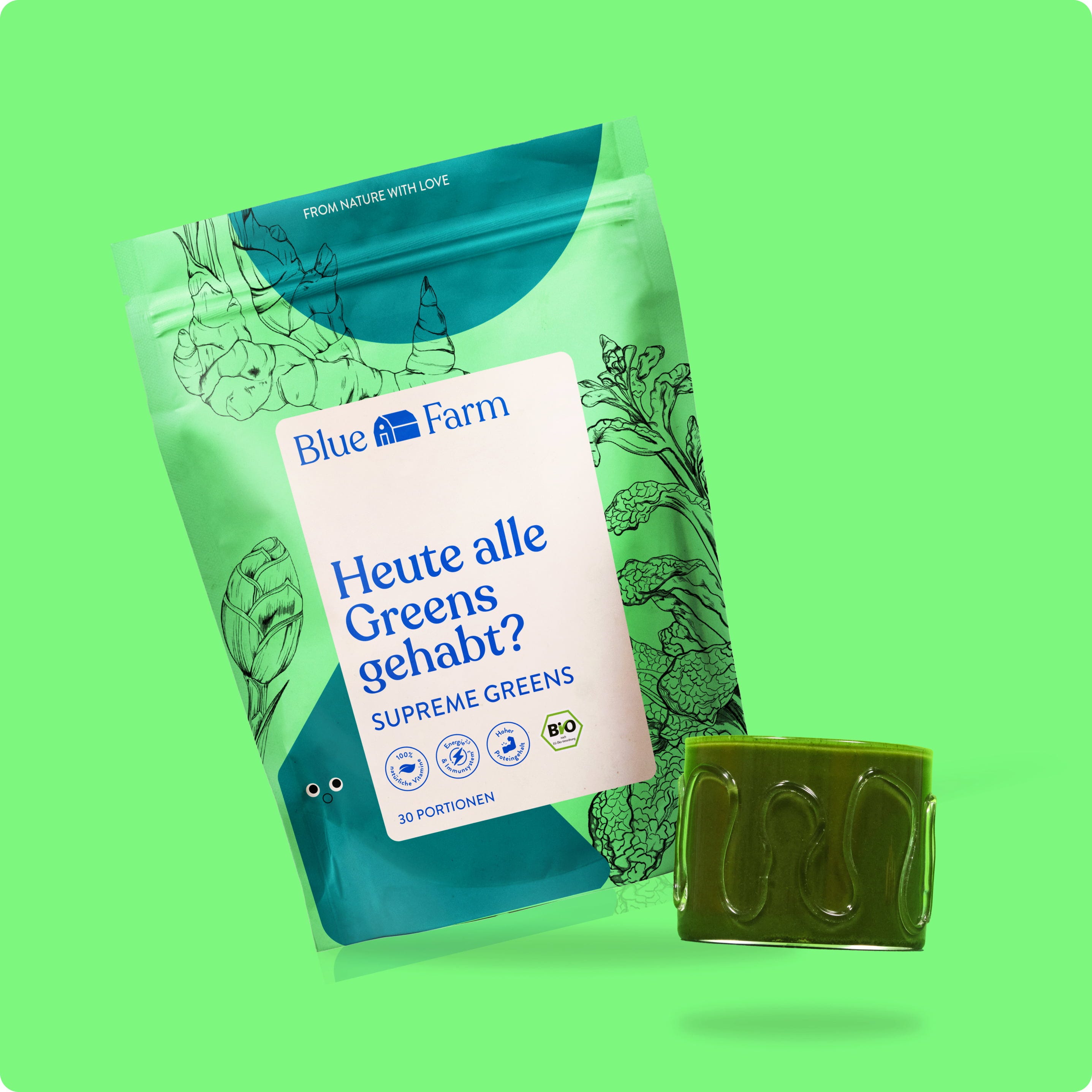 Био Supreme Greens напитката на прах от Blue Farm предлага богата на хранителни вещества смес от био плодови и зеленчукови прахове, водорасли, протеини и адаптогени от лечебни гъби. Без добавена захар, този продукт е лесно all-in-one решение за ежедневието. Благодарение на лесното приготвяне с вода или растително мляко, Supreme Greens е идеален за всички, които нямат много време, но държат на разнообразие и качество.