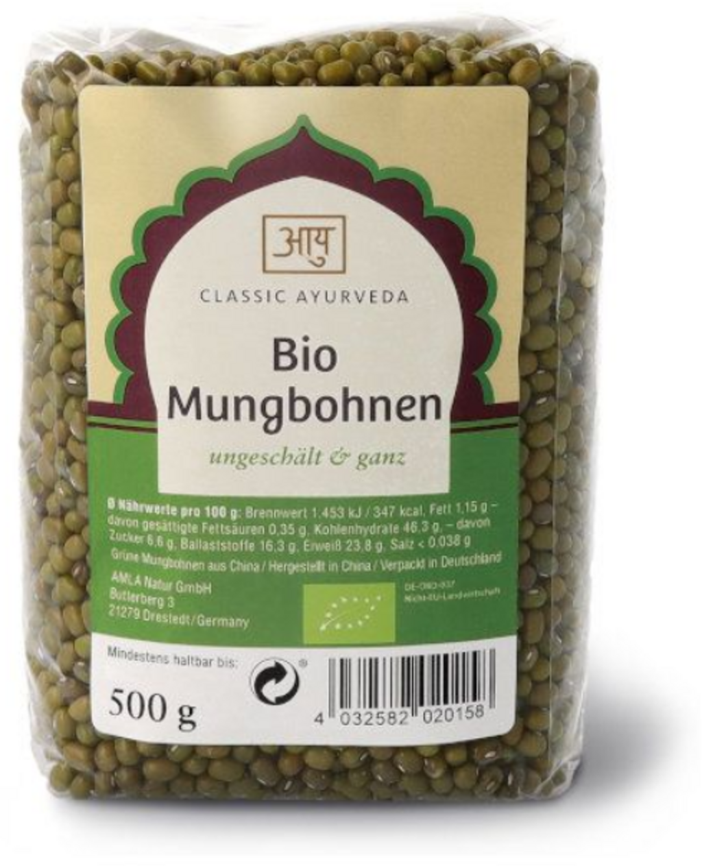 Зеленият мунг боб е ценен заради своята универсалност в аюрведичната кухня. Целите, небелени бобови зърна запазват формата си по време на готвене и имат плътна консистенция, подходяща за салати и запеканки. Благодарение на своята структура те могат да се използват и за приготвяне на свежи кълнове. Продуктът произхожда от контролирано биологично земеделие и представлява богата на фибри основа за балансирано хранене.