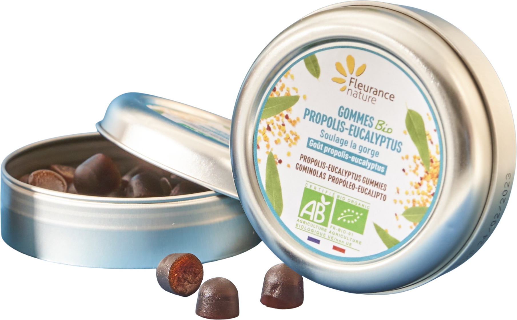 Тези желирани бонбони съчетават прополис и етерично масло от евкалипт. Съдържат също кафява захар и мед. Удобната малка кутия се побира лесно във всяка торбичка и е идеалното решение за съхранение на желираните бонбони – освен това, тя може да се пълни отново с пълнителите.