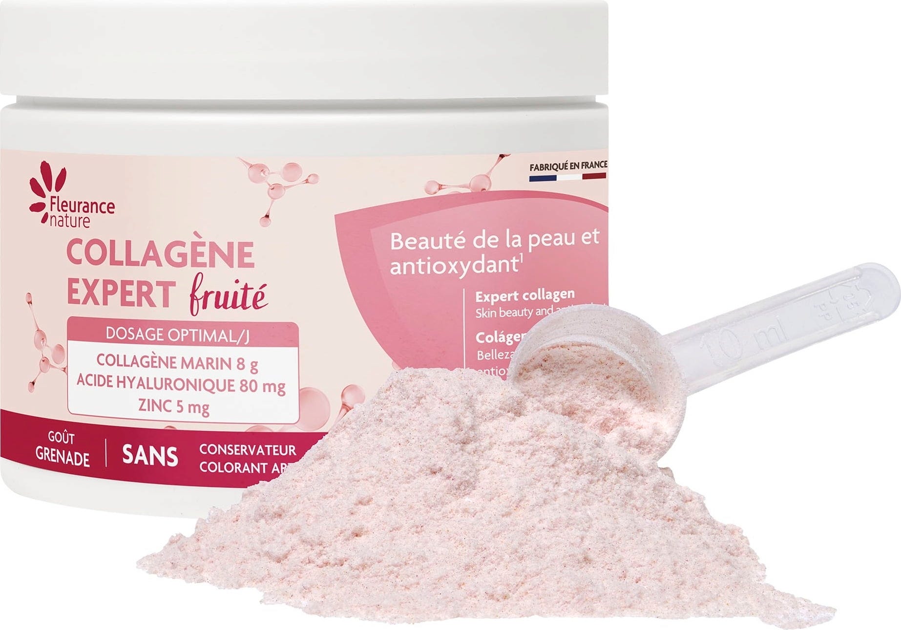 Тази пудра комбинира морски колаген тип I с хиалуронова киселина. Колагенът тип I (Naticol®), който съдържа, се произвежда чрез ензимен процес и идва от контролирани източници. Цинкът допълва формулата. Вкусът напомня на нар.