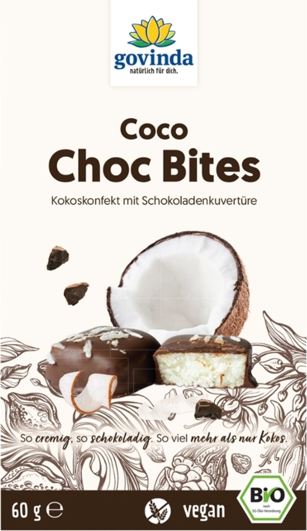 Coco Choc Bites от Govinda са тропическо изкушение от фини кокосови стърготини и ценно кокосово масло. Нежната сладост на агаве сироп се съчетава хармонично с леко горчивата нотка на шоколадовата кувертюра с минимум 70% какао. Това веган био конфектно изделие се приготвя от съставки от контролирано биологично земеделие и е качествена алтернатива за почитателите на екзотични сладки удоволствия.