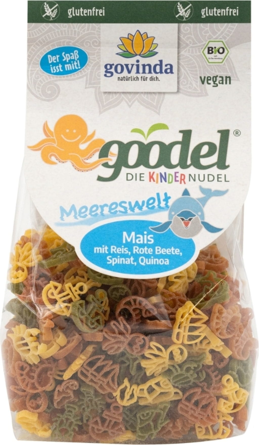 Kinder-Goodel „Meereswelt“ от Govinda носят пъстро паста забавление във форми на морски обитатели. Произведени в италианско мануфактурно качество, меката основа от царевица и ориз е естествено обогатена с червено цвекло, спанак и киноа. Щадящо изсушената паста е безглутенова и предлага класическа „al dente“ текстура. Осъзнат избор за разнообразно хранене в семейната кухня.