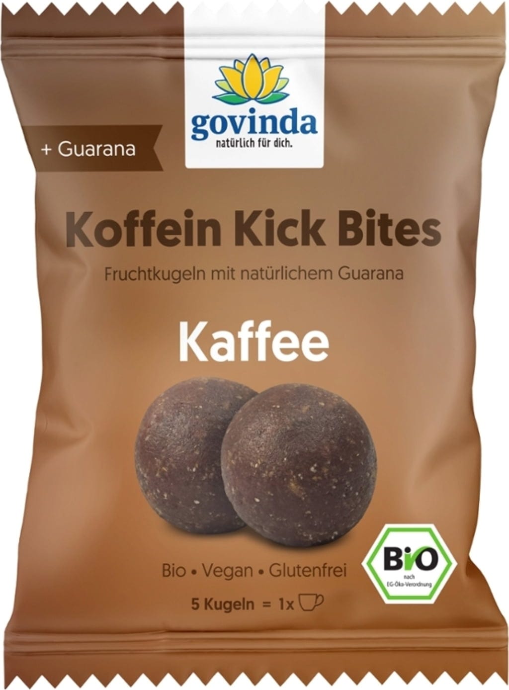 Kick Bites от Govinda съчетават естествената сладост на фурми и земни бадеми с ароматен екстракт от кафе. Допълнени с нарязани лешници и истинска гуарана, тези топчета предлагат интензивен аромат с био качество. Безглутеновото и веган конфектно изделие е удобен избор за осъзнат снакс, без изкуствени добавки.
