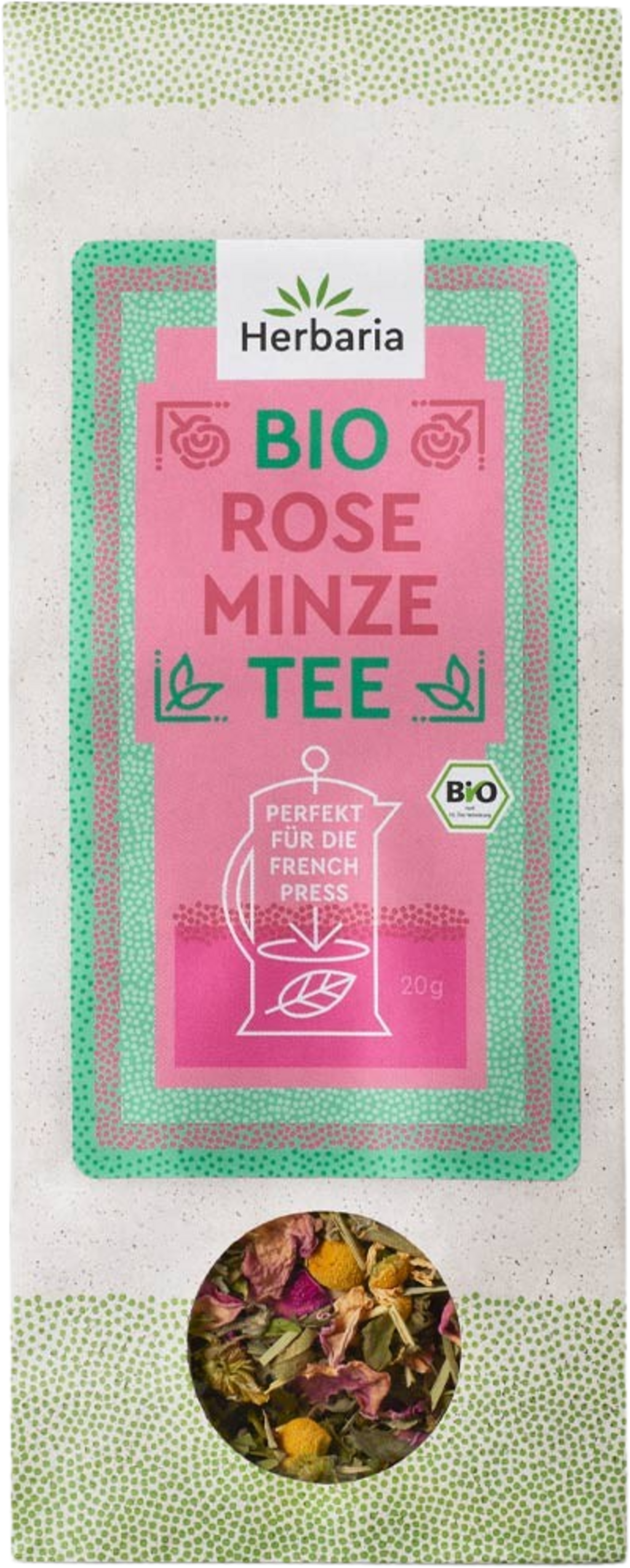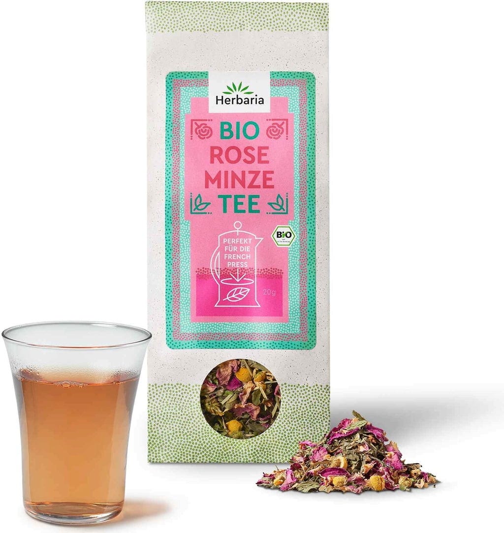 Свежа мента и интензивни розови цветове обгръщат сетивата със съблазнителен цветен аромат, докато балансираната рецептура впечатлява с чиста свежест и деликатна сладост. За приготвяне във French Press. Опитайте Bio Rose Minze Tee предпочитано с ориенталски ястия или шоколадови десерти. Гарантирано без добавки.