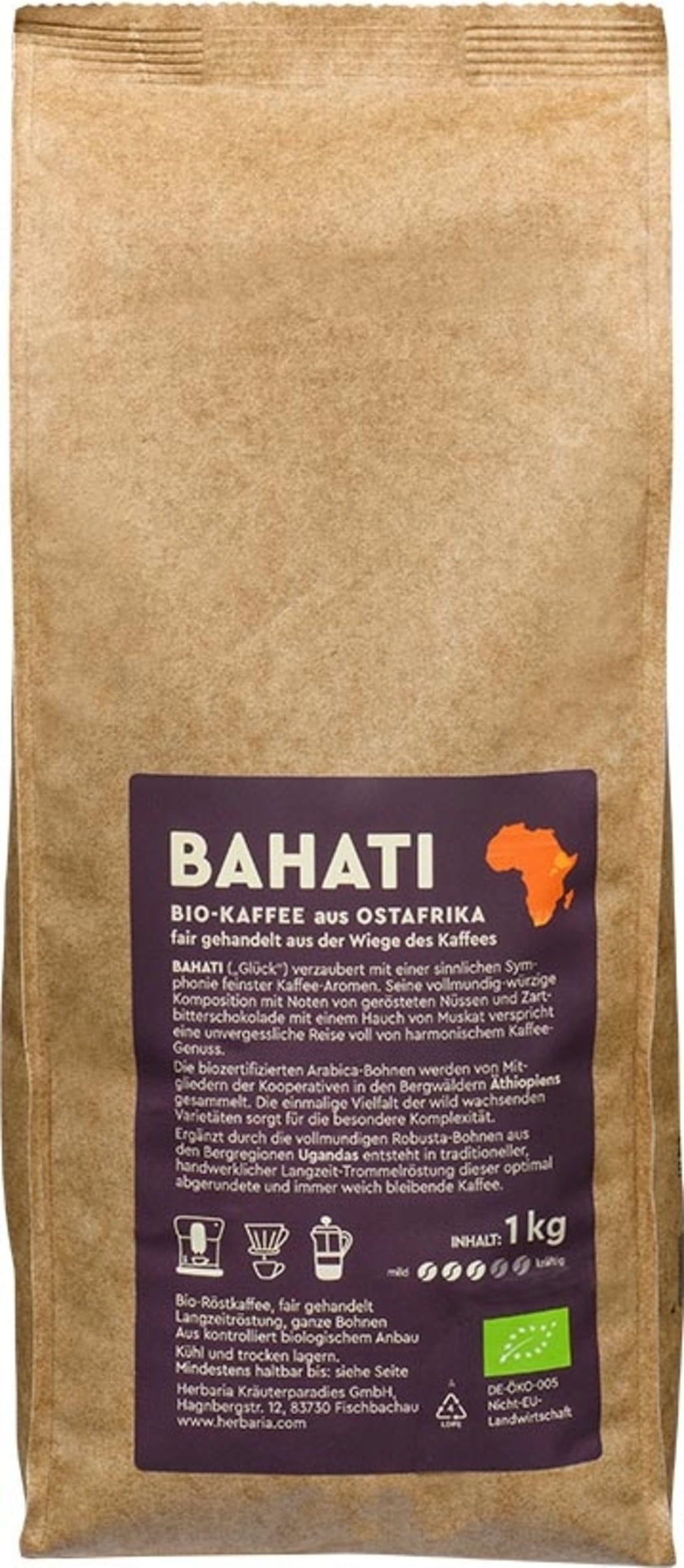 BAHATI означава „щастие“ – и това само по себе си много точно описва фините кафе аромати от Източна Африка. Това био кафе ви отвежда с плътната си пикантна композиция, съчетаваща нотки на печени ядки, натурален черен шоколад и лек нюанс на индийско орехче.