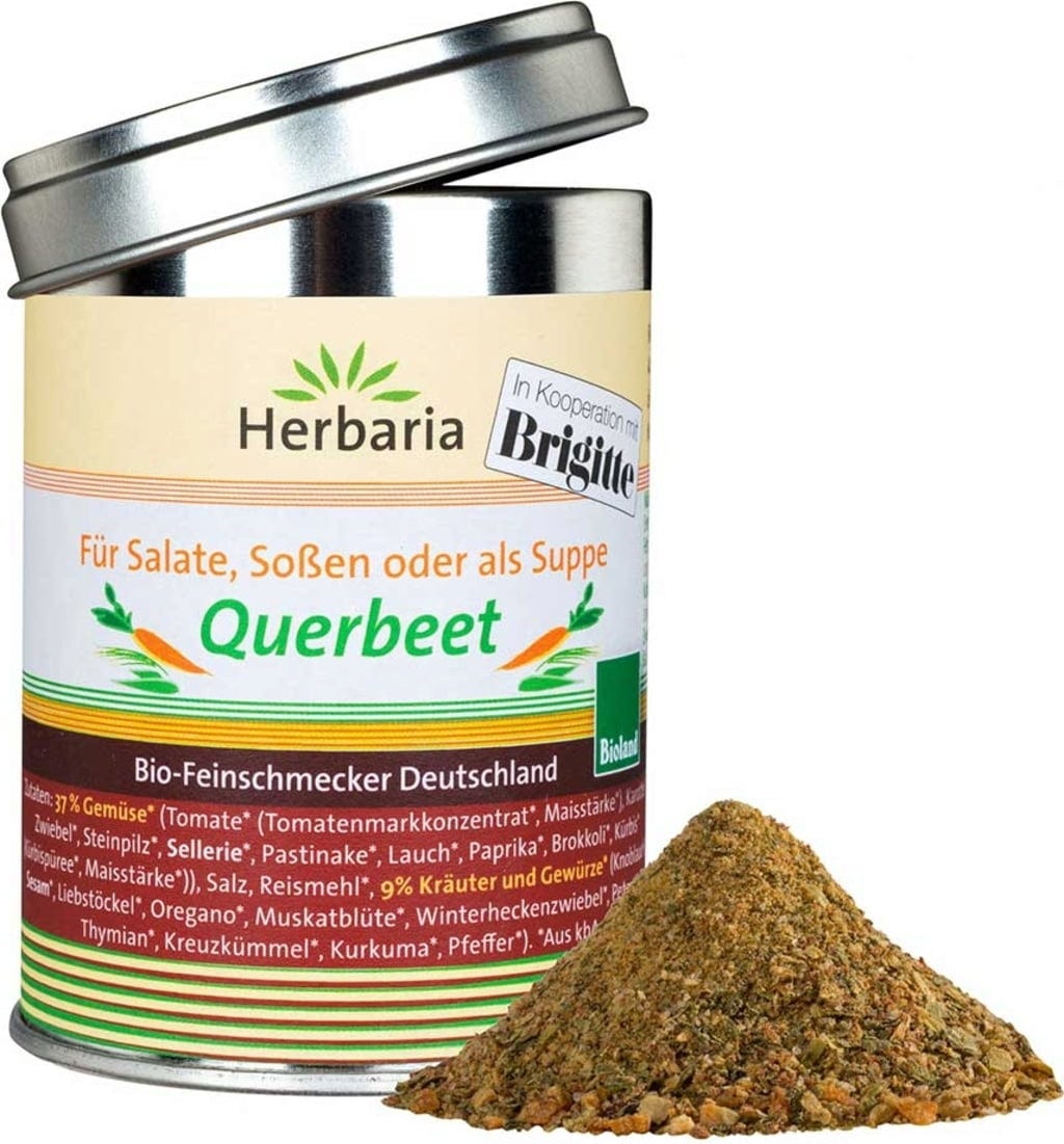 37 % зеленчук[1] (Домати[1] (Доматено пюре концентрат[1], царевично нишесте[1]), морков[1], лук[1], манатарки[1], целина[1], пащърнак[1], Праз-лук[1], Червен пипер[1], броколи[1], Kürbis[1] (тиквено пюре[1], царевично нишесте[1])), Сол, оризово брашно[1], 9 % билки и подправки[1] (Чесън[1], Сусам[1], девесил[1], Риган[1], цветя на индийско орехче[1], зелен лук[1], магданоз[1], Thymian[1], Кимион[1], куркума[1], Пипер[1])