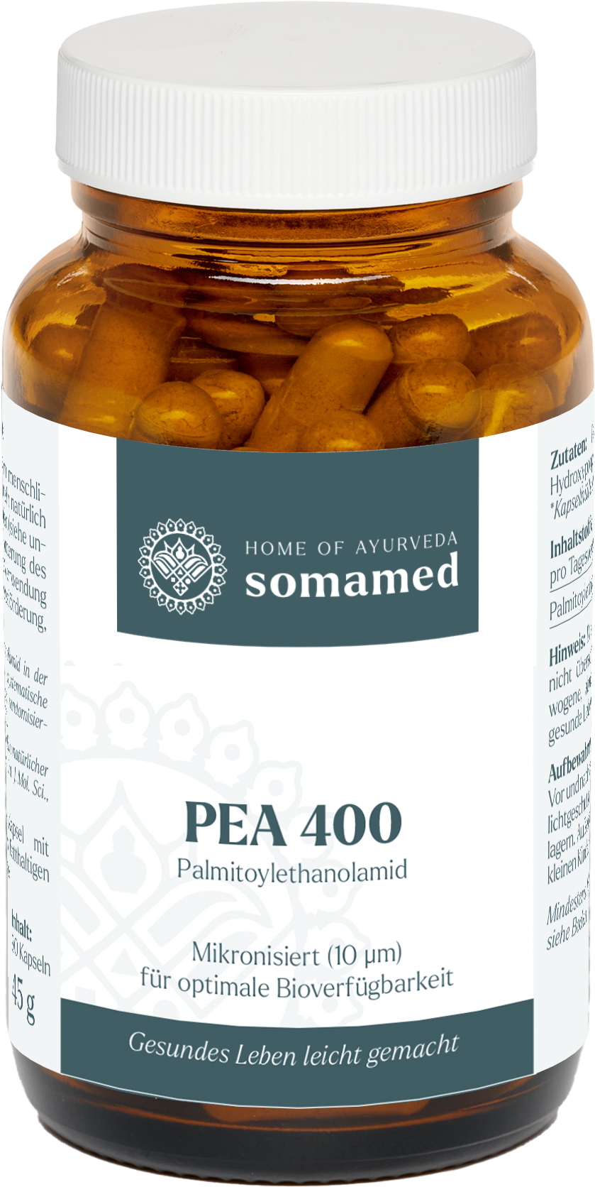 PEA 400 от Home of Ayurveda somamed съдържа палмитоилетаноламид (PEA) в нова, микронизирана формула. Особено финият размер на частиците (95% < 10 µm) постига подобрено разтваряне в храносмилателния тракт. Микронизираните форми на PEA се считат за технологично оптимизиран вариант в специализираната литература.