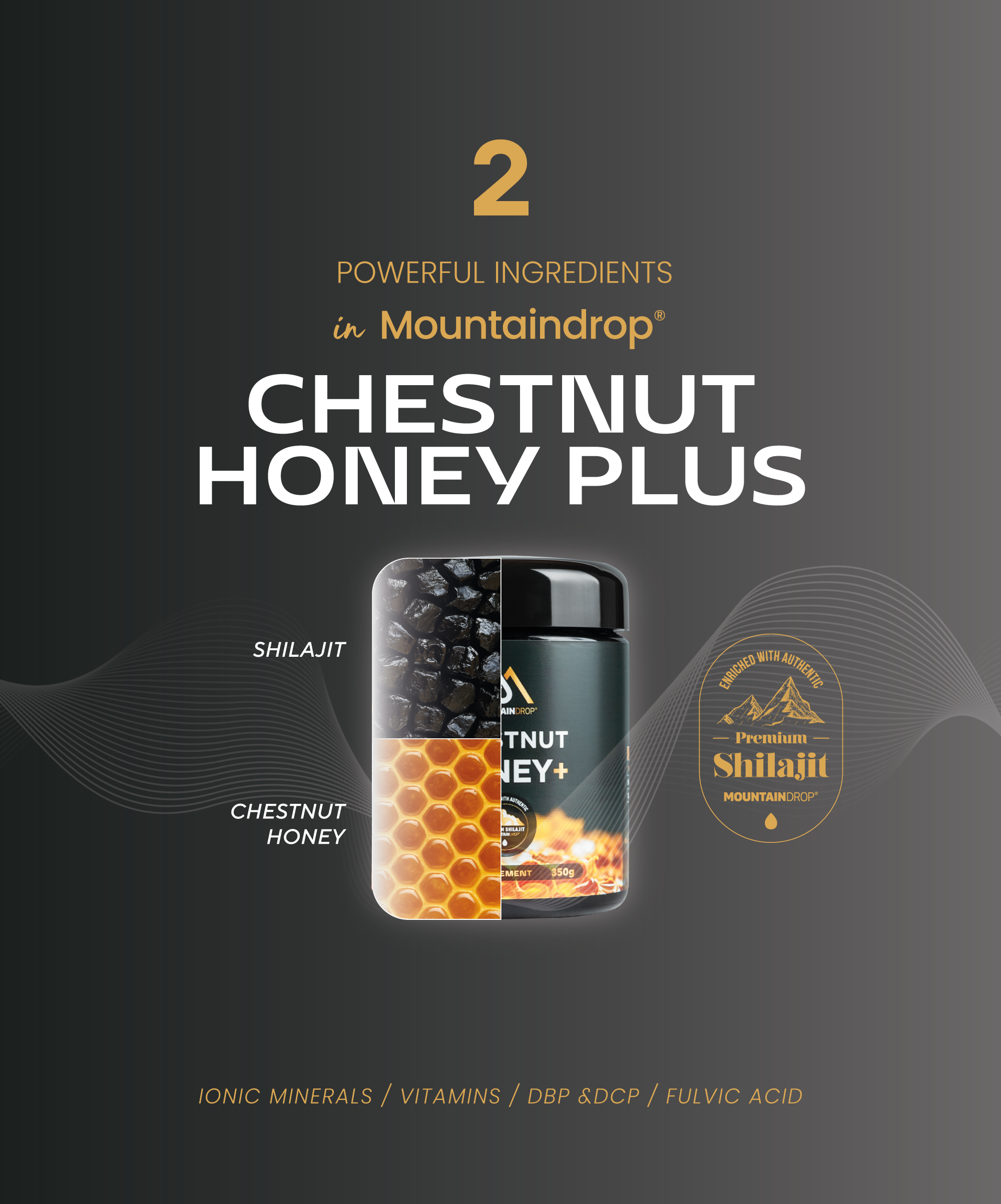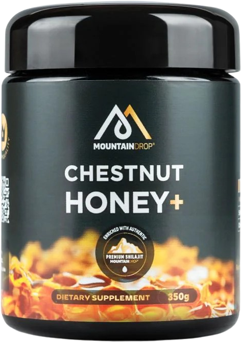 Chestnut Honey+ от Mountaindrop е иновативен комбиниран продукт, който съчетава богатата на минерали сила на алтайския Shilajit с ценните свойства на натуралния кестенов мед. Формулата разчита на естествената синергия между двата компонента, за да осигури прием на над 85 хранителни вещества в особено приятна за консумация форма. Произведена в Словения при строг качествен контрол, тази комбинация предлага висока биологична стойност за ежедневната рутина. Всяка партида се тества независимо за чистота и микробиологична безопасност, за да се гарантира сигурен натурален продукт с премиум качество.