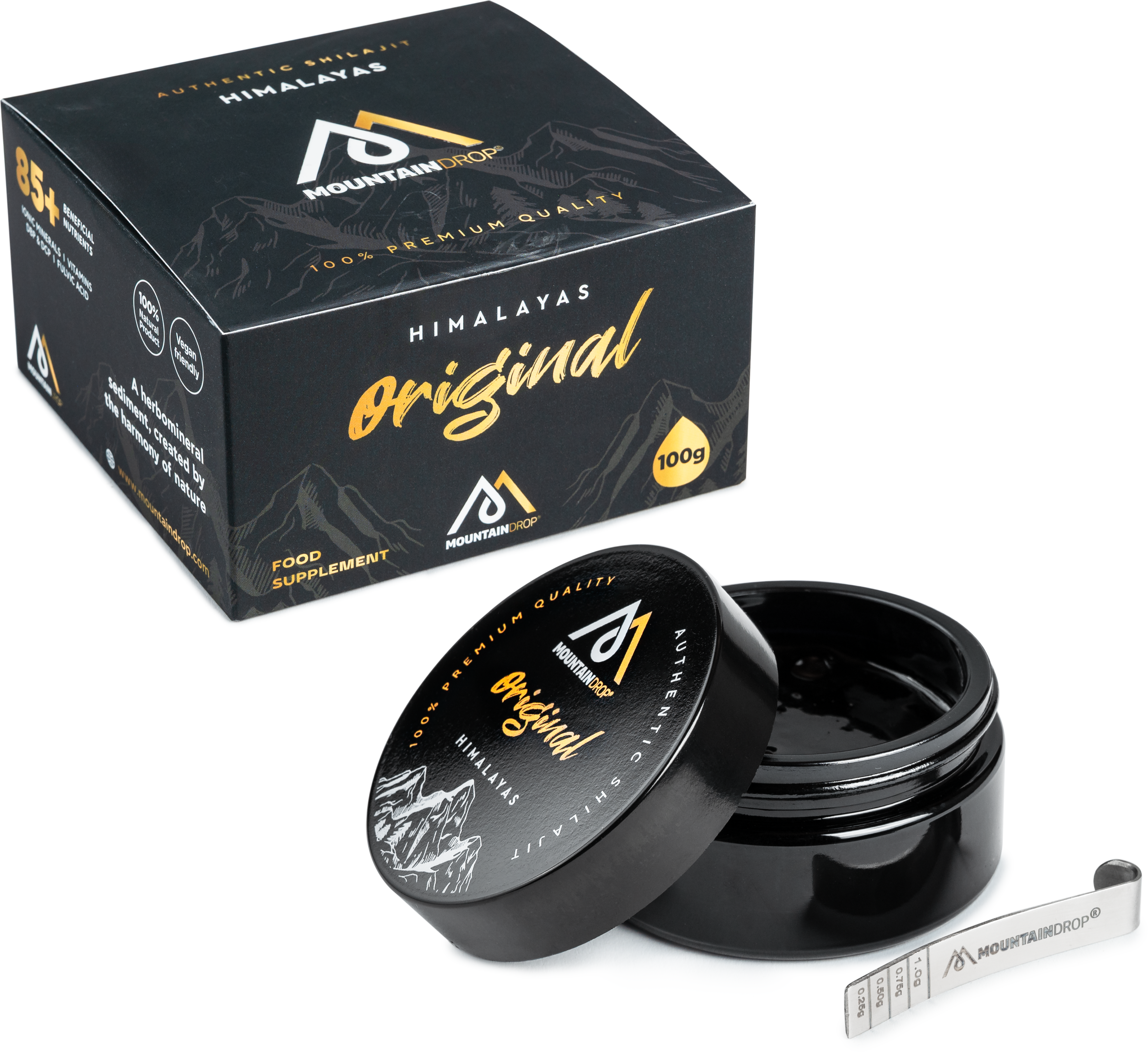 Original Himalayan от Mountaindrop е ексклузивна натурална смола, добивана в недокоснатите райони на Хималаите на надморска височина над 5 000 метра, и се счита за един от най-концентрираните източници на биологично активни вещества. Добивът се извършва традиционно на ръка през летните месеци, последван от щадящ процес на пречистване при температури под 40 °C, за да се запази напълно сложната структура на над 85-те съдържащи се хранителни вещества. Поради екстремните условия на образуване този Shilajit се отличава с изключителна чистота и висока концентрация на фулвокиселини. Всяка партида преминава строг контрол от независими лаборатории, за да се гарантира пълна липса на тежки метали и микробиологични замърсявания.