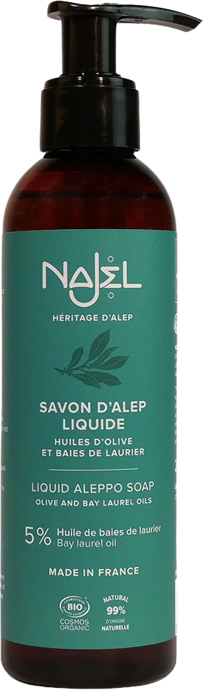 Открийте истинския сапун Aleppo в течна форма, който е подходящ и за суха, чувствителна и раздразнена кожа. Това е автентичен продукт, който е известен в цял свят. Najel го произвежда изключително с органичен зехтин и органично масло от лаврови плодове, за да предостави естествен продукт с изключително качество. Открийте цялото Know-How на сирийските майстори сапунджии с този сапун Алепо!