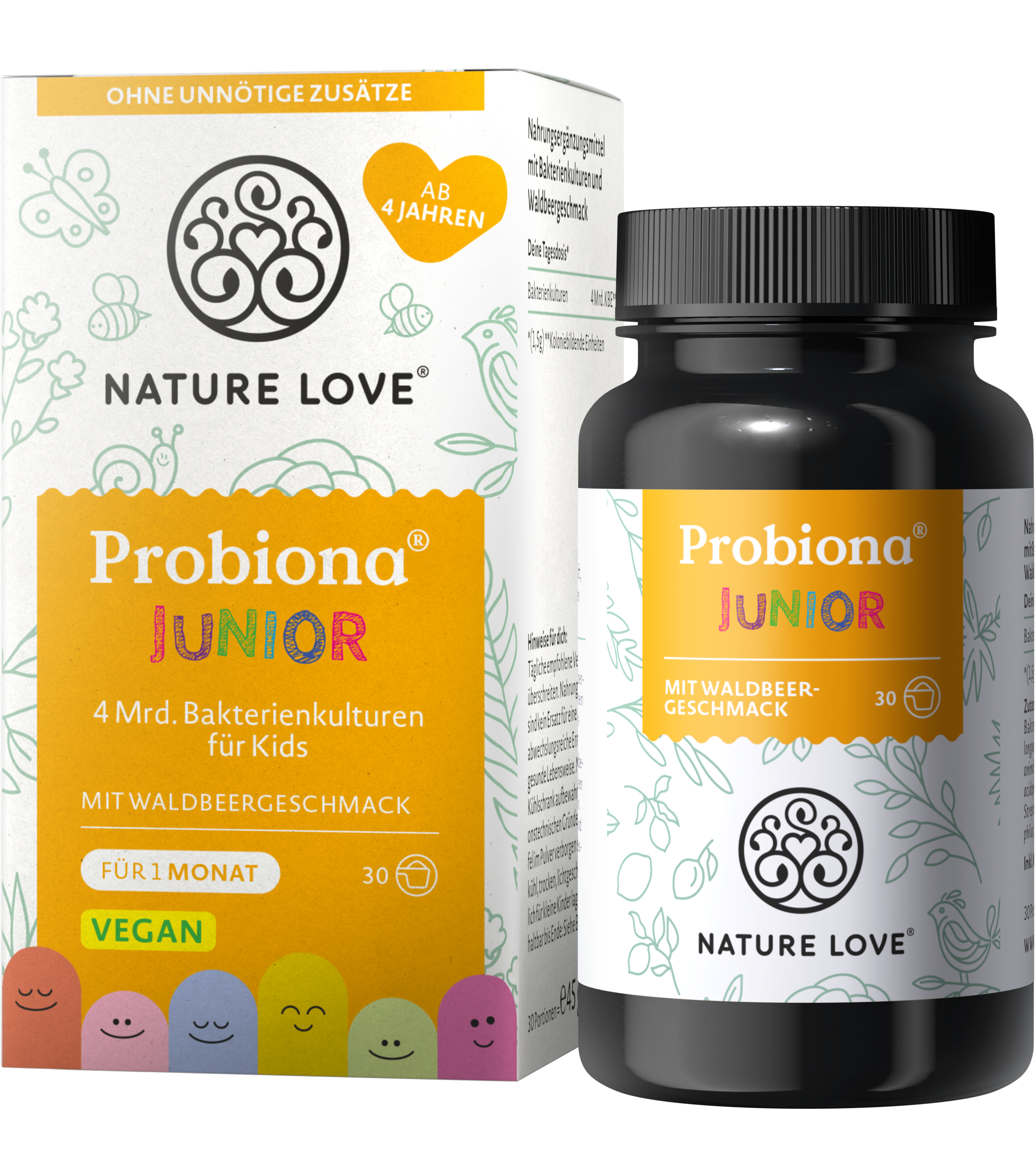 Probiona Junior® от Nature Love е веган прах, който осигурява на деца от 4-годишна възраст дневна доза от 4 милиарда пробиотични култури от 5 различни бактериални щама. Формулата съдържа следните щамове: