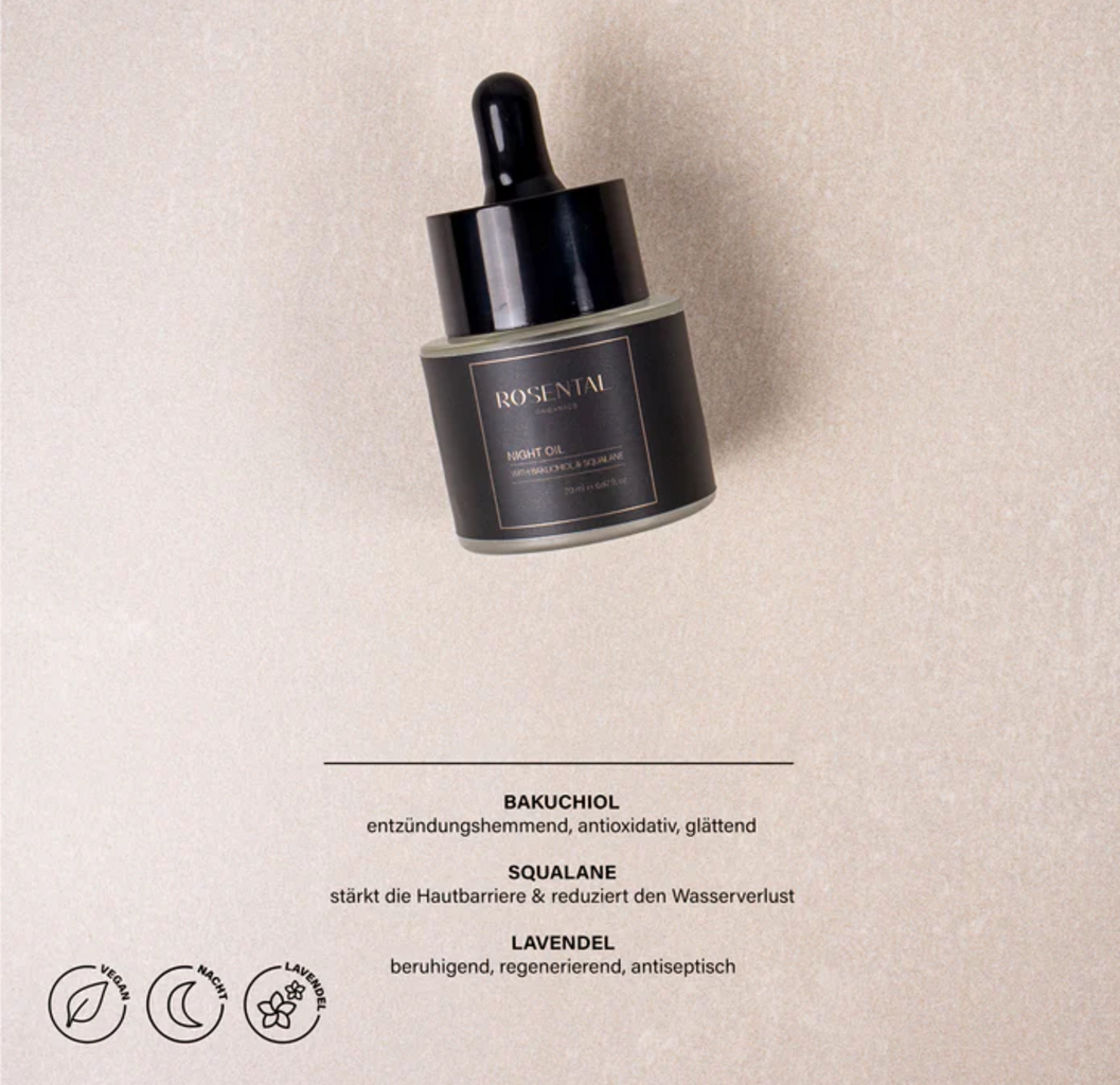 Това леко масло е идеално за вечерна грижа за лицето, тъй като подпомага усвояването на активните съставки за грижа за кожата. Висококачествената комбинация от бакучиол и сквалан осигурява копринено гладко усещане на кожата, без да оставя мазен филм. Формулата осигурява интензивна хидратация и същевременно предотвратява загубата на влага. Благодарение на лавандуловото масло през нощта се осъществява и процес на регенерация, за да бъде кожата ви жизнена и укрепена, когато се събудите. Aроматът е приятно балсамов и тревист.