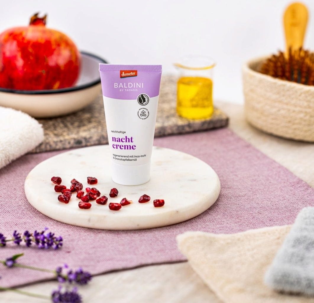 Този нощен крем е формулиран със 100% натурално масло от семена на нар, богато на рядката омега-5 мастна киселина. Тя укрепва липидния слой на кожата и едновременно я прави по-еластична. С подкрепата на маслото от инка инчи кремът подобрява и поддържа липидния баланс на кожата, като ѝ осигурява дълготрайна хидратация. Благодарение на маслото от семена на нар кремът подпомага регенерацията и осигурява антиоксидантна защита. Това стимулира обновяването на клетките и прави кожата по-устойчива. Нощният крем е особено подходящ за суха и взискателна кожа.