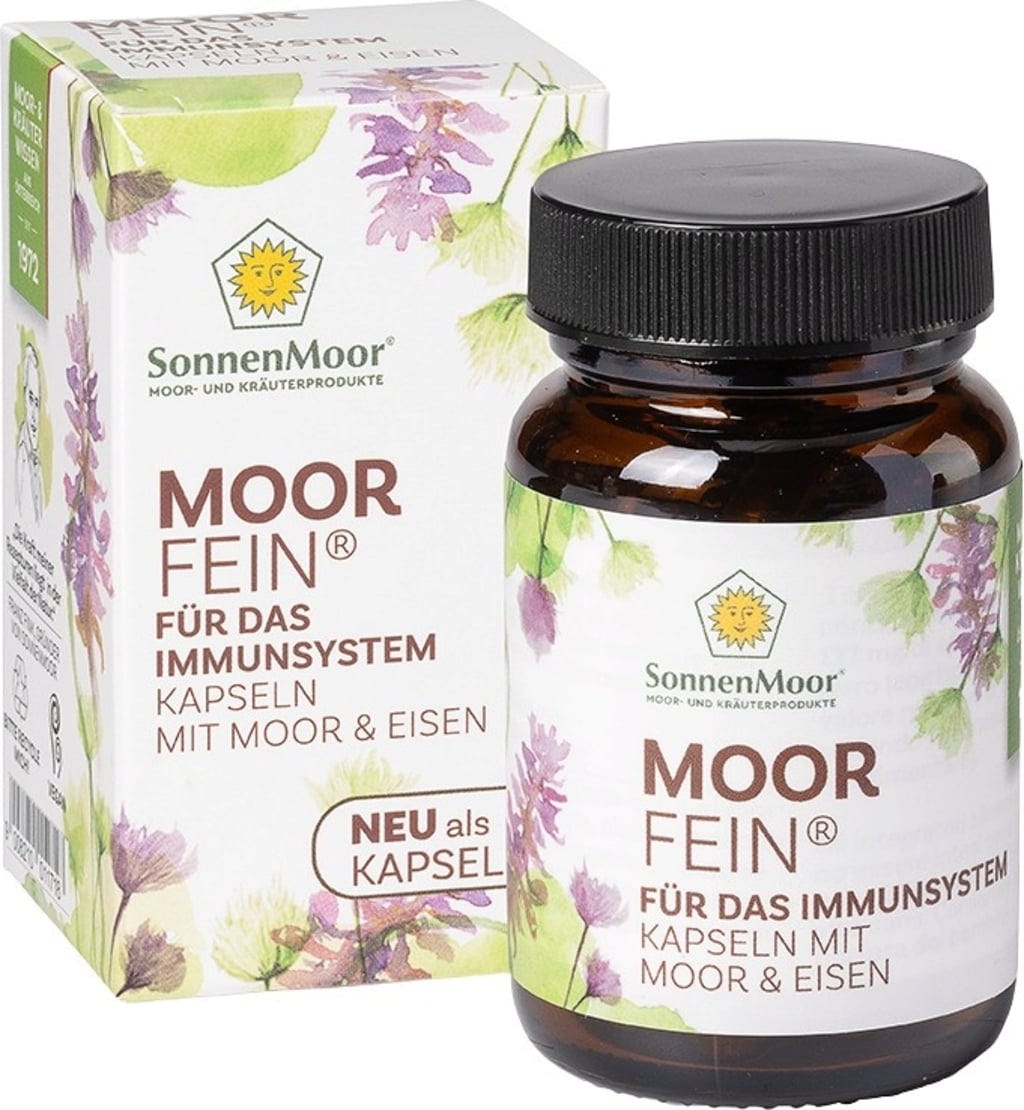 Капсулите MoorFein от SonnenMoor съдържат изсушен торфен прах, добит от ценния слой на торфището Leopoldskron в Залцбург. Този натурален продукт по природа съдържа хуминови киселини, както и минерали и микроелементи като калций и магнезий. За допълване на формулата е добавен железен глюконат, за да осигури целенасочен прием на този важен микроелемент.