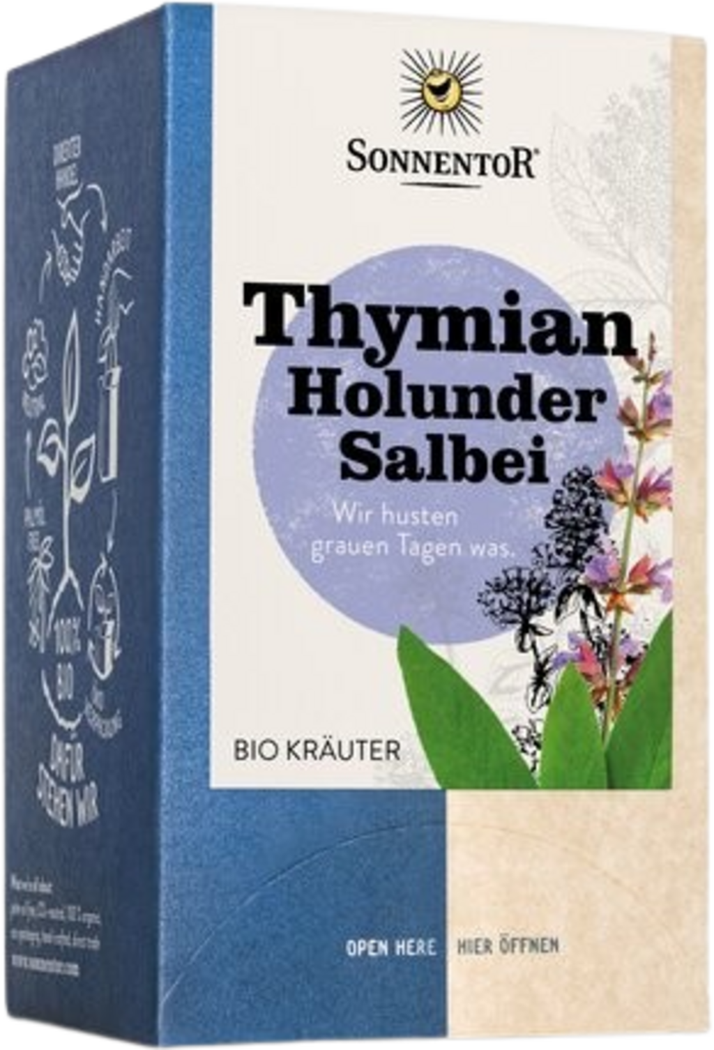 Трио за студения и влажен сезон. Мащерка, бъз и салвия съчетават комбинация от етерични, билкови и флорални вкусови компоненти. От векове се смята, че тези три съставки са идеалната зимна смес и не бива да липсват в чаения шкаф през зимата. Оригинална билкова смес от Sonnentor.