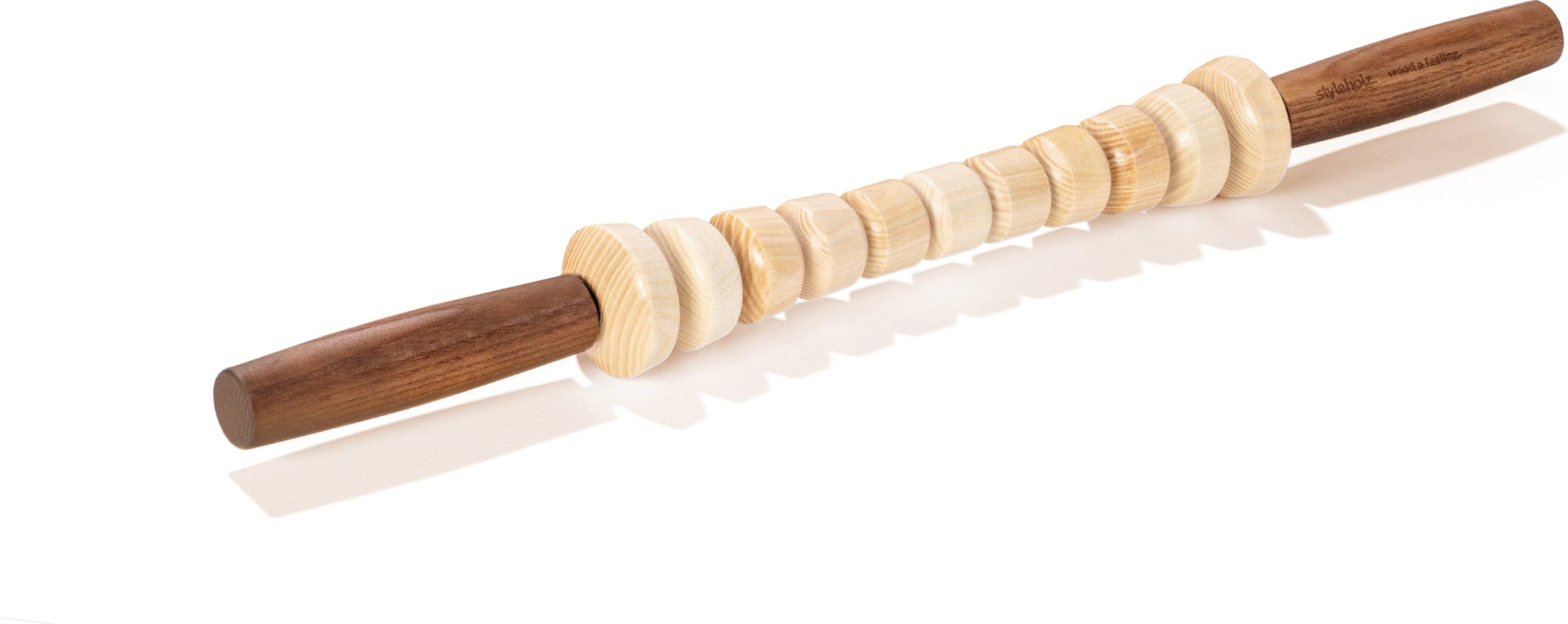 Woodstick FLEX от Styleholz впечатлява със своята специална гъвкавост и отличителна релефна повърхност. Изработен от висококачествена местна ясенова дървесина в австрийска манифактура, благодарение на гъвкавото си ядро той се адаптира оптимално към контурите на тялото ви. Повърхността осигурява интензивна точкова стимулация по време на приложение върху големи мускулни групи като бедра, прасци или гръб. Благодарение на ролките с лагери инструментът се плъзга нежно по кожата, а чрез ергономичните дръжки винаги запазвате пълен контрол върху интензивността. Финишът с натурално масло прави дървото особено щадящо към кожата и дълготрайно.