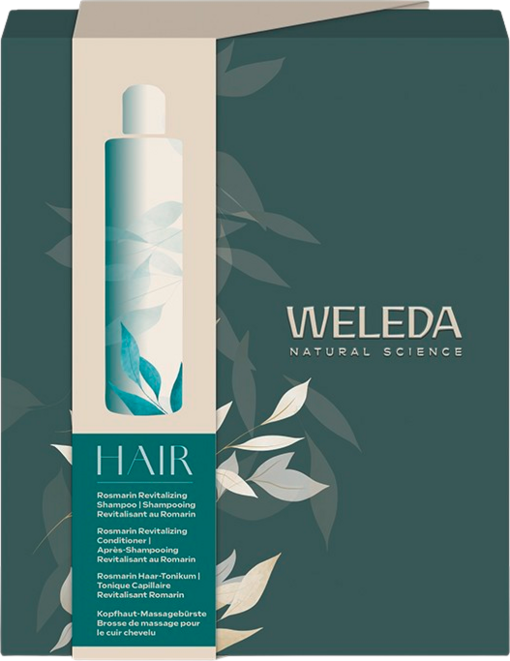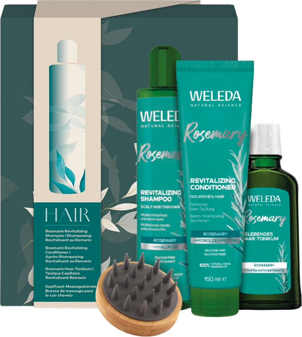 Комплектът с розмарин предлага естествена грижа за косата с красив блясък - за всички типове коса и чувствителен скалп. Той съдържа три ревитализиращи козметични продукта и безплатна четка за релаксиращ масаж на скалпа.