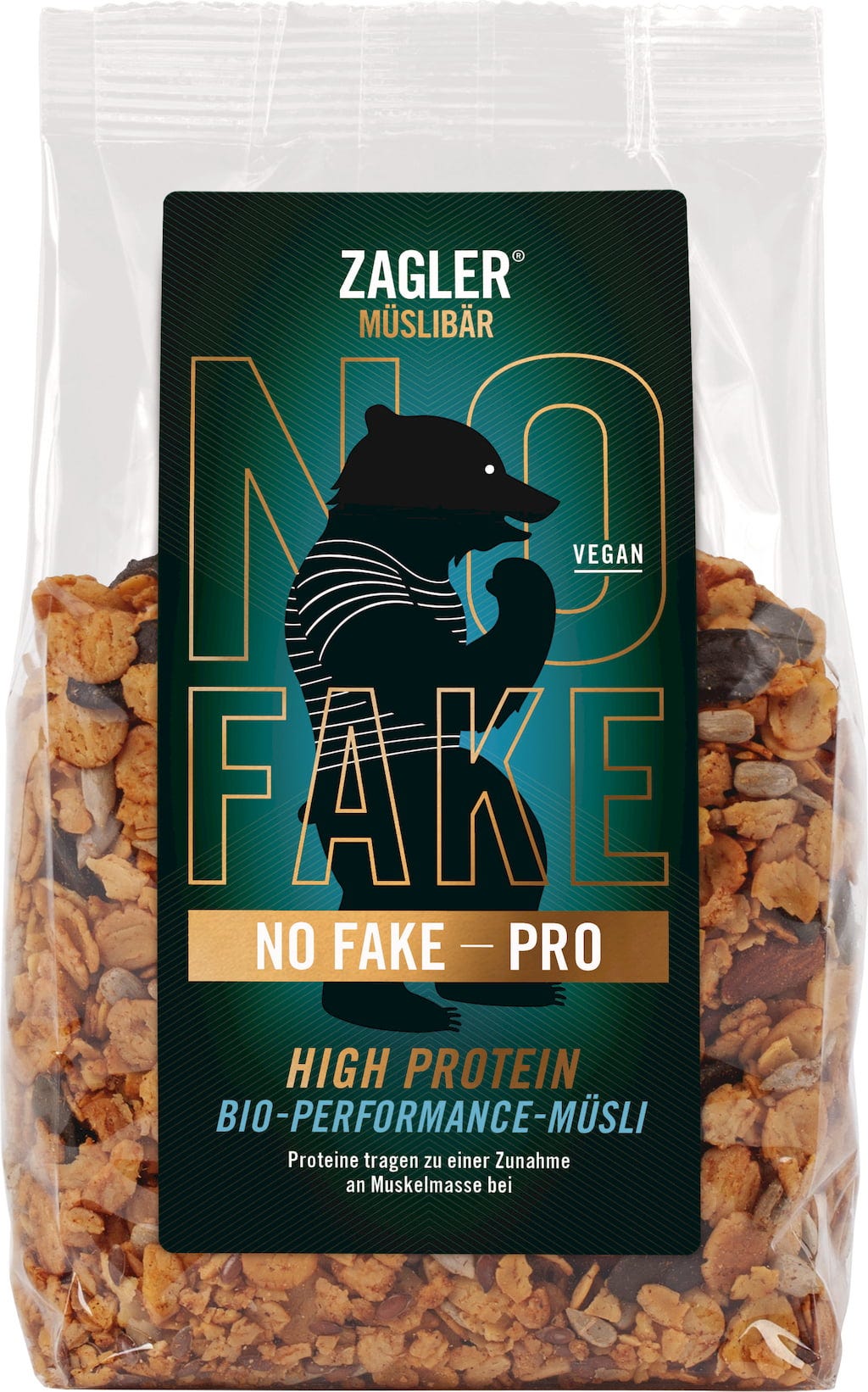 Хрупкавото и веган био NO FAKE PRO High Protein мюсли на Zagler Müslibär съдържа соеви люспи вместо зърнени култури и допълнително е без палмова мазнина, както и без цвеклова и тръстикова захар. Подсладено е с агаве сироп. Бадеми, слънчогледови и тиквени семки осигуряват приятно ядков вкус.